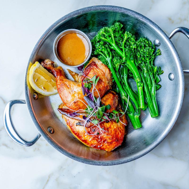 Half Roasted Chicken with Swiss Chard & French Fries, Herbs Chicken Jus