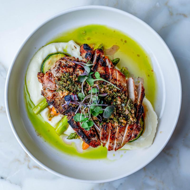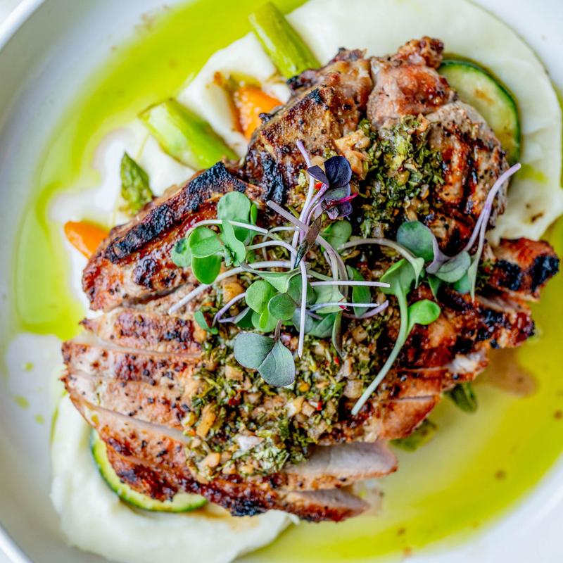Pan Roasted Pork Porterhouse, Mashed Potatoes, Baby Carrots & Basil Chimichurri