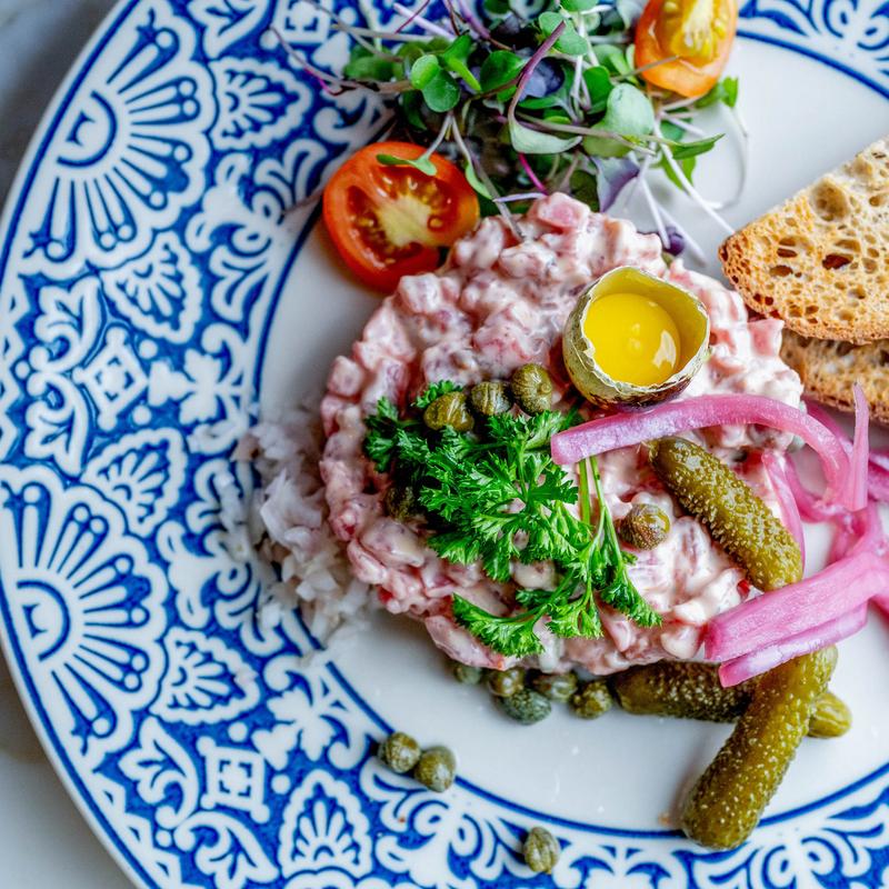 Parisian Style Beef Tartare, Capers, Cornichons & Quail Egg