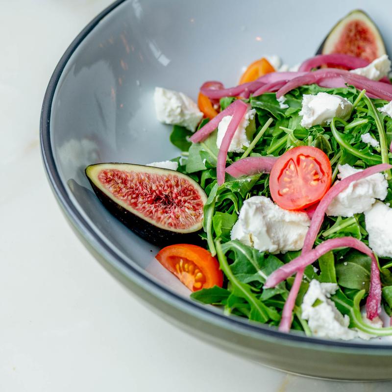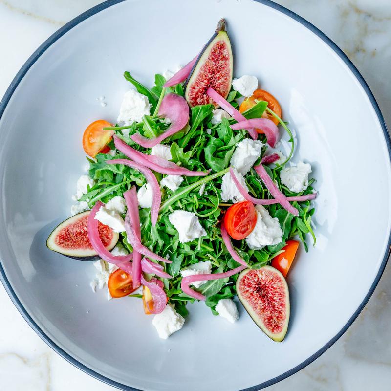 Crumbled Goat Cheese with Arugula Salad, Figs & Honey Balsamic Vinaigrette