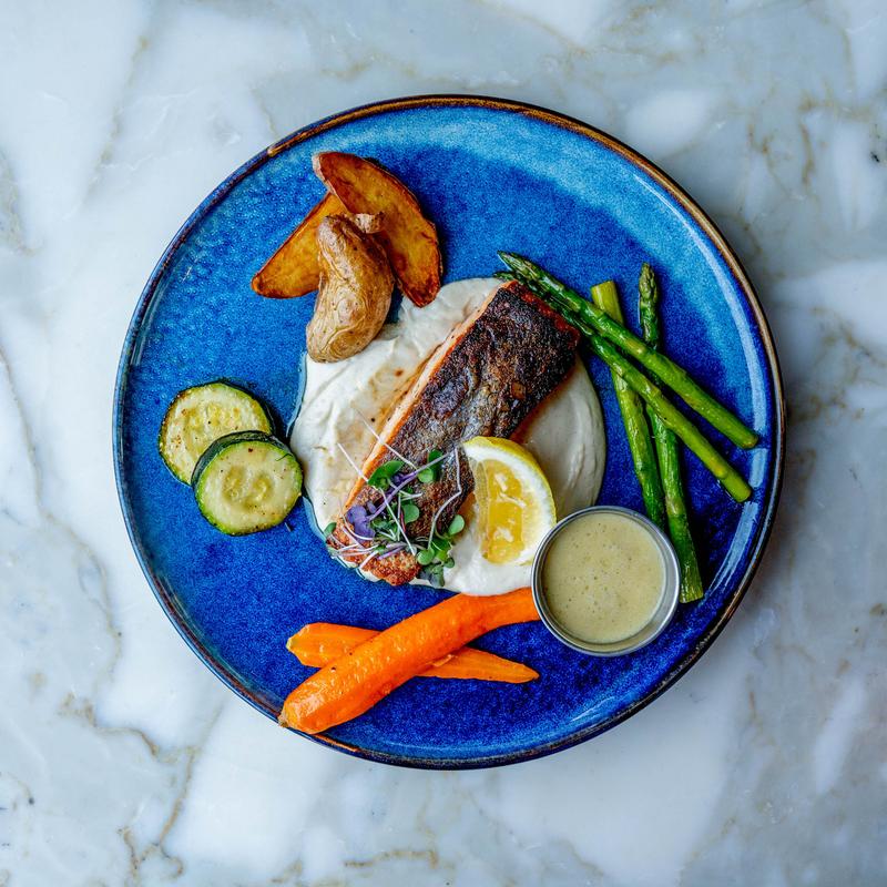 Seared Salmon with Cauliflower Purée, Asparagus, Roasted Potatoes & Baby Carrots Over a Tarragon Cream Sauce